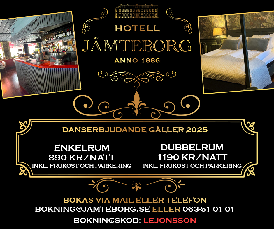 Boka gärna boende hos vår samarbetspartner Hotell Jämteborg som ligger 5 minuters bilfärd från Folkets Hus. Hotellet ligger i centrala Östersund och erbjudandet inkluderar parkering, wifi och en smarrig frukostbuffé. För bokning mejla bokning@jamteborg.se eller ring 063- 510 101, ange kod "Lejonsson" för specialpris.